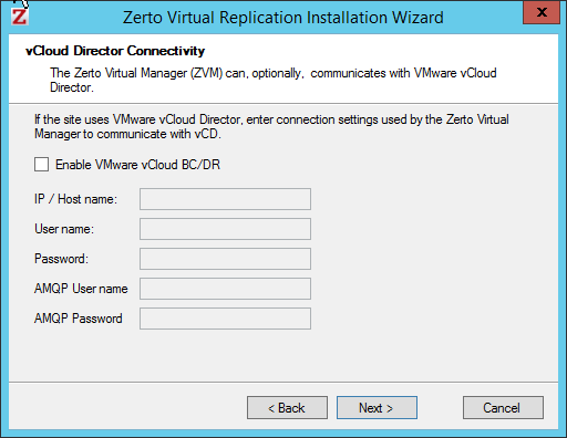Zerto provides an AMQP installation kit if you do not have one installed for vCD. Run ZertoAMQPInstallWizard.exe as described in the Zerto Cloud Manager Administration Guide, with the following credentials: