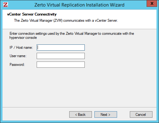 11. Enter connection settings that the Zerto Virtual Manager uses to communicate with the vCenter Server: