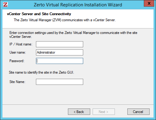 Site Name – A name to identify the site. This name is displayed in the Zerto User Interface.