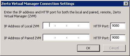 3. Specify the IP address and HTTP port number for the Zerto Virtual Managers managing the protection of the virtual machines, both for the local site and, optionally, for the paired, remote site. If the same vCenter Server is used both for protecting and recovering virtual machines, specify the IP address and HTTP port number for the single Zerto Virtual Manager installed.