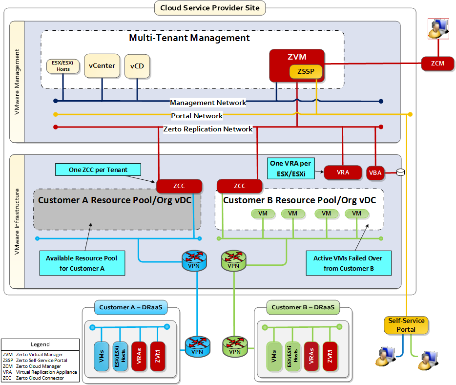 The following diagram shows the basic DRaaS architecture. DRaaS organizations can manage their disaster recovery via the Zerto User Interface. The diagram shows two users, both using VMware environments. These organizations can use either VMware vSphere or Microsoft SCVMM to connect to the Cloud Service Provider.