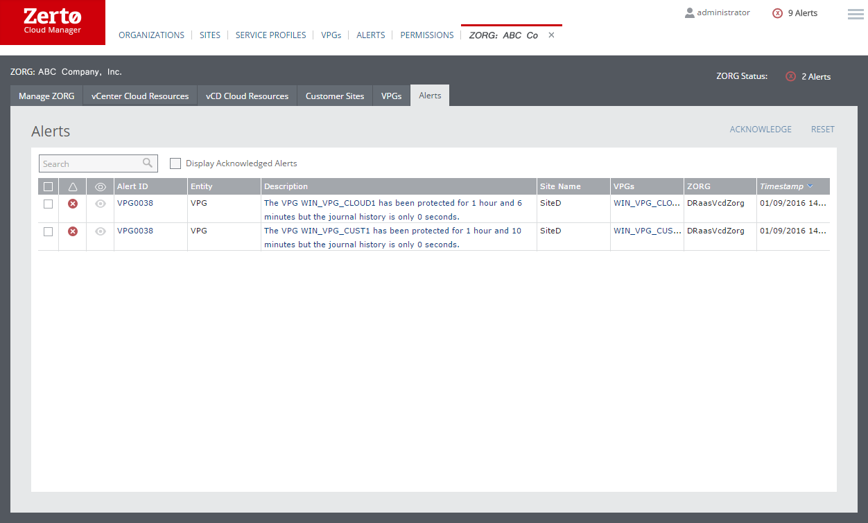 The alerts for a specific ZORG are displayed in the ZORG Alerts tab.