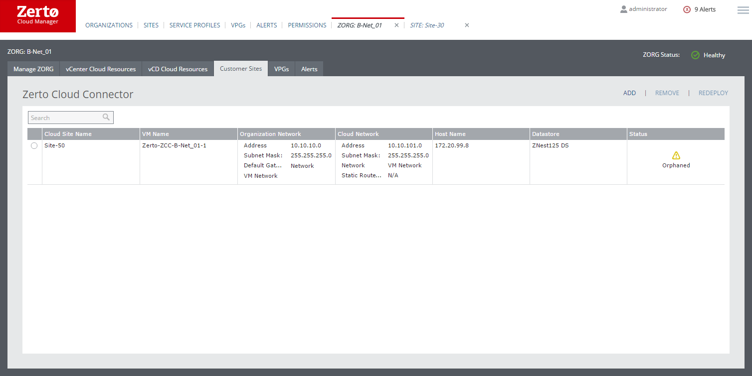 Note: An orphaned cloud connector means that a connection cannot be made to the cloud connector, often because the configuration is invalid or the ports to access the connector are blocked in the Zerto Virtual Manager.