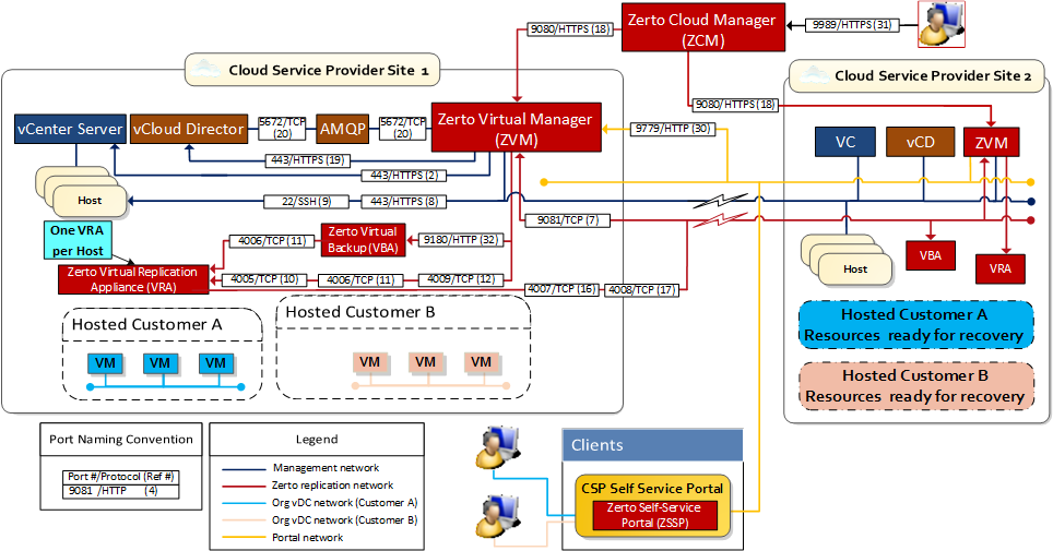 The following diagram shows the basic ICDR architecture with the required ports. ICDR organizations can manage their disaster recovery via the Zerto Self-service Portal.