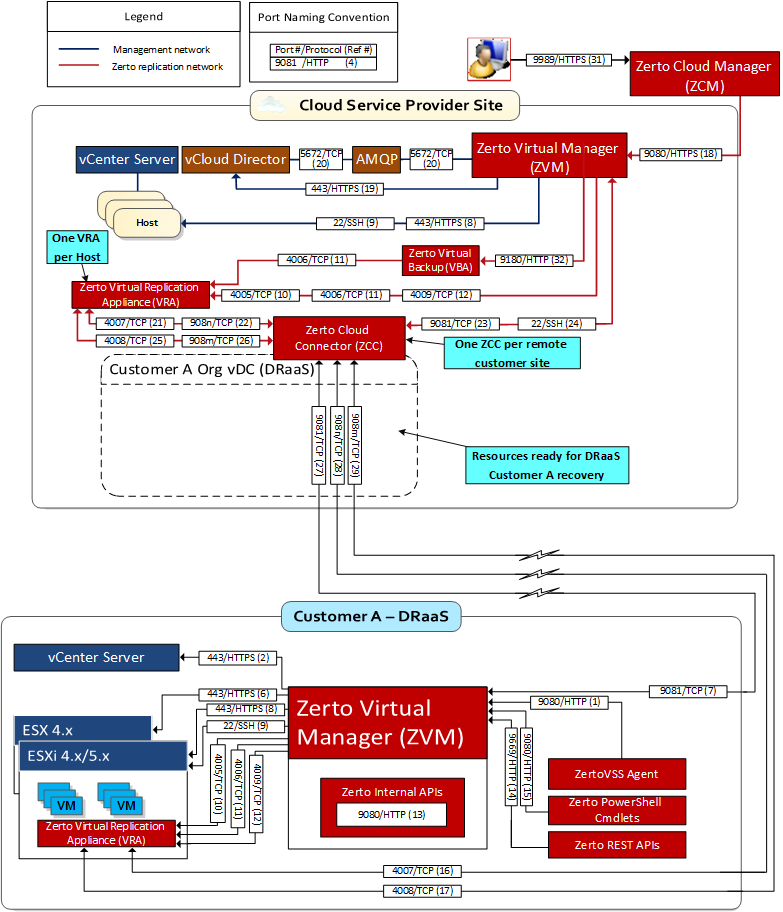 22 | 9,24 | During Virtual Replication Appliance (VRA) installation on ESXi 4.x, 5.x hosts for communication between the ZVM and the ESXi and Hyper-V host IPs, and for ongoing communication between the ZVM in the cloud site – but not the customer site – and a Zerto Cloud Connector. |