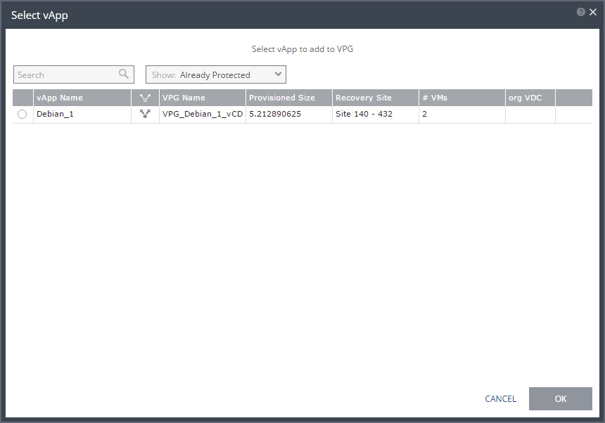 Note: vApps can be protected in a maximum of three VPGs. These VPGs cannot be recovered to the same site. vApps protected in the maximum number of VPGs are not displayed in the Select VMs dialog.