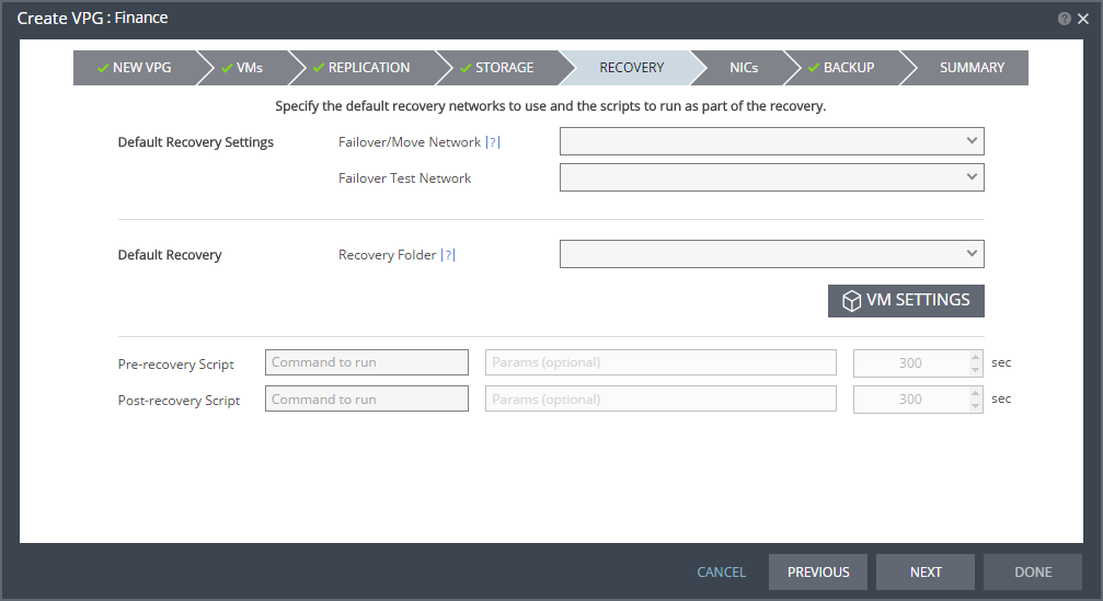 20. To specify a recovery folder for each virtual machine in the VPG, click VM SETTINGS.
