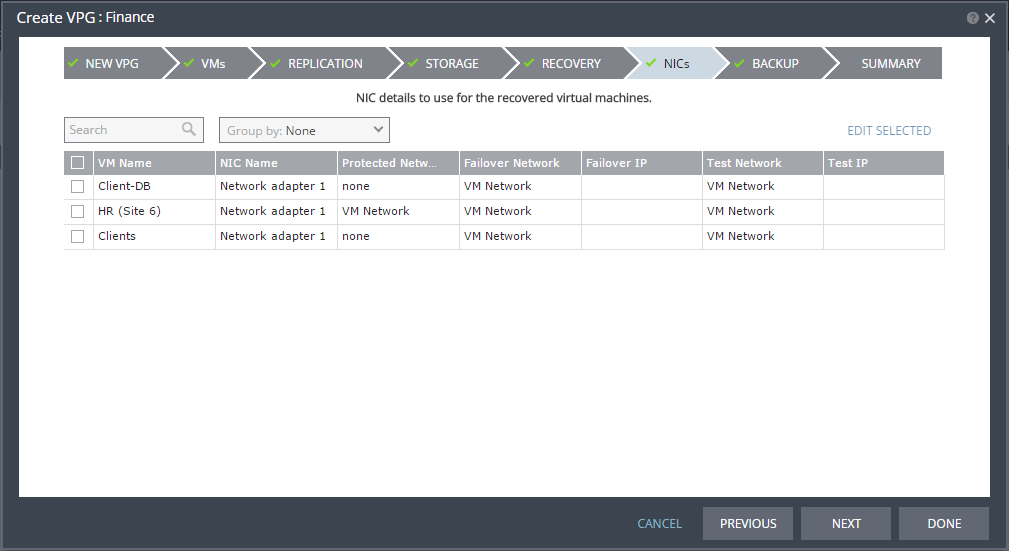 Note: Steps that do not require input are marked with a check mark. You can jump directly to a step that has been marked with a check mark to edit the values for that step. Every step must be marked with a check mark before you can click DONE to create the VPG.