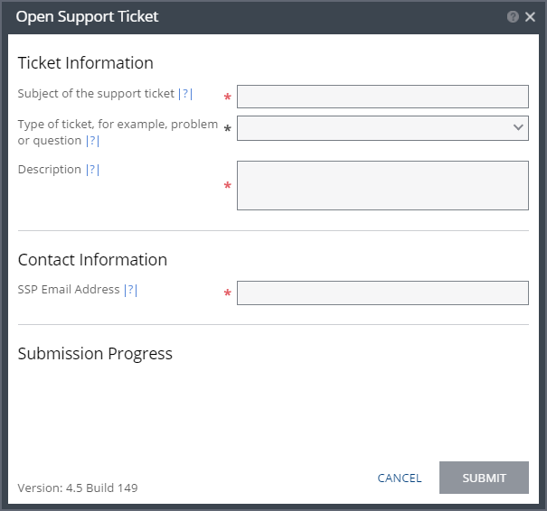 After a support ticket is submitted, its progress is displayed. If the email address is not valid, the ticket is rejected. Once ticket submission starts, it cannot be canceled.
