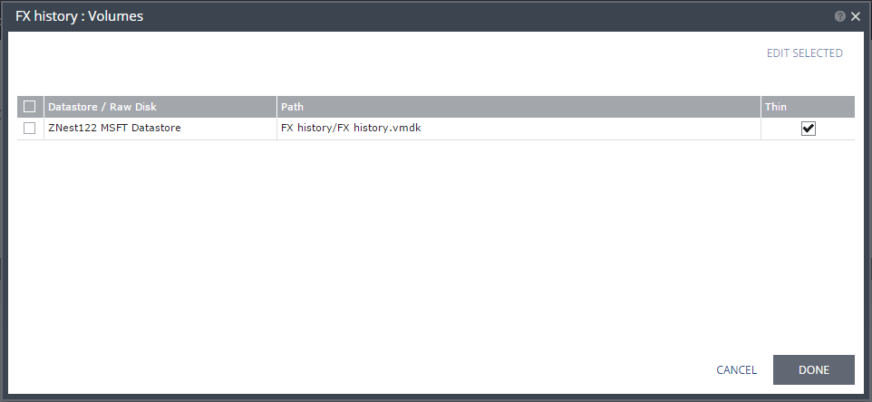 When restoring an offsite backup to the recovery site, this dialog shows the datastores for a selected virtual machine in the VPG. You can choose to edit information in one field by clicking the field and updating the information. You can choose to edit several datastore settings at the same time by selecting the datastores and clicking EDIT SELECTED.