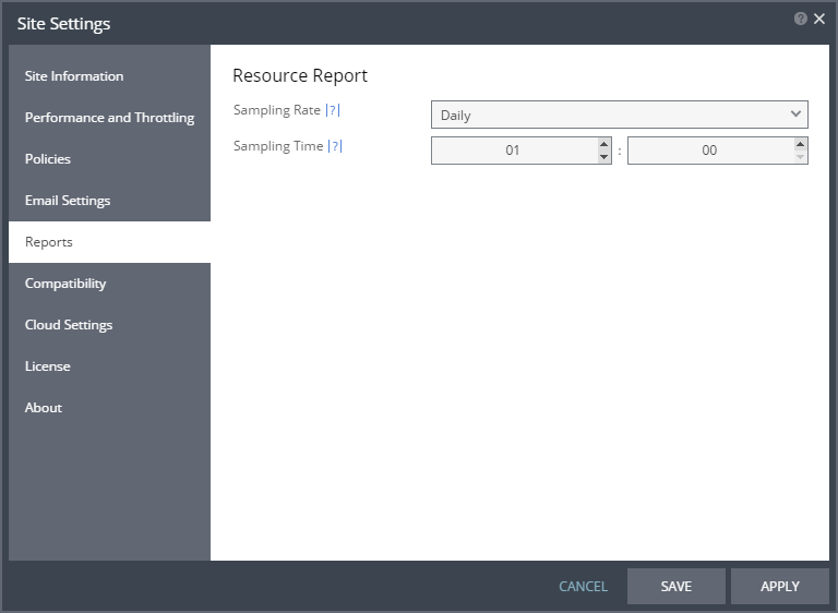 Sampling Rate – When to take resource samples to identify resource usage, either daily at a specific hour and minute or hourly at a specific minute within each hour. Note that collecting a sample hourly provides a higher resolution picture of replication traffic than if samples are only collected once a day.