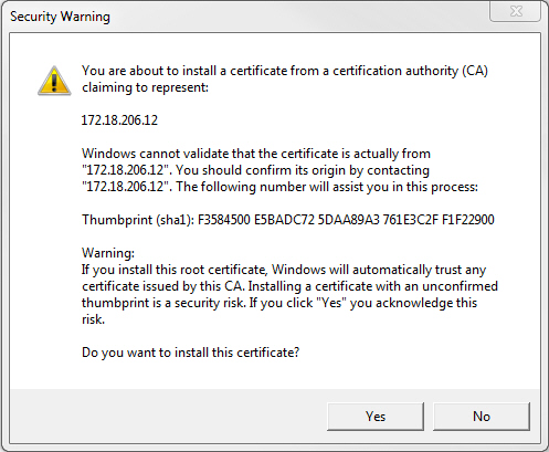 6. Click OK when prompted and then Yes in the Security Alert dialog to continue.