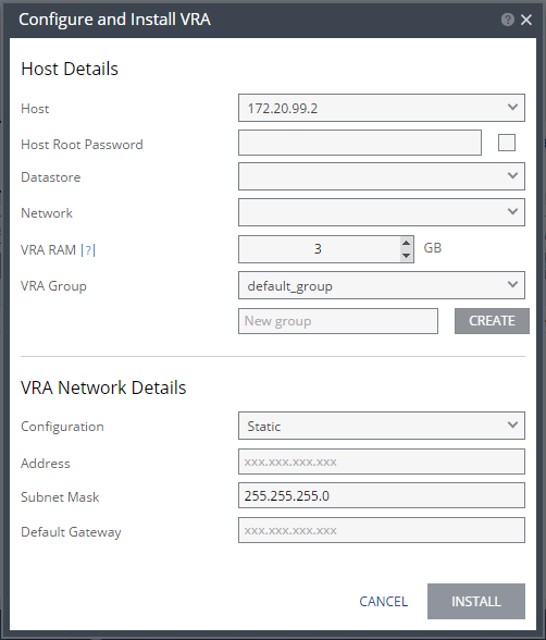 Host – The host on which the VRA is installed. The drop-down displays the hosts that do not have a VRA installed, with the selected host displayed by default.