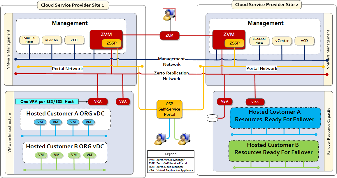 The following diagram shows the basic ICDR architecture. ICDR organizations can manage their disaster recovery via the Zerto Self-service Portal.