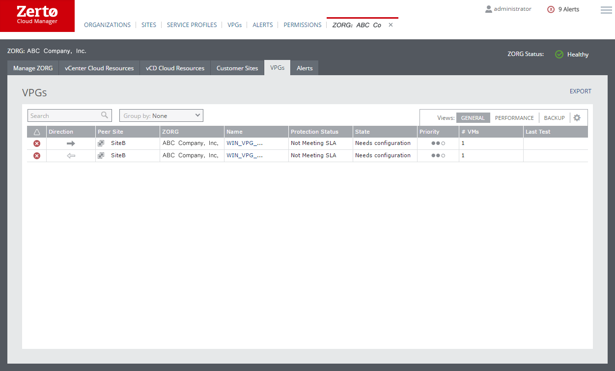 All VPGs protected or recovered for a specific ZORG can be monitored from the ZORG VPGs tab.