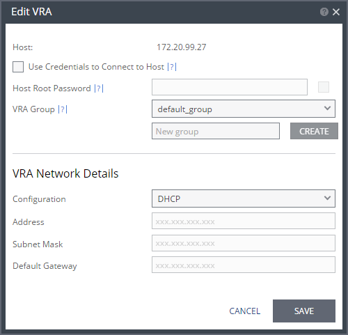 Host Root Password – When the VRA should connect to the host with a password, check Use credential to connect to host and enter the root user password used to access the host. When the box on the right side is checked, the password is displayed in plain text.This field is only relevant for ESXi 4.x and 5.x hosts. This field is disabled for ESX 4.x hosts.