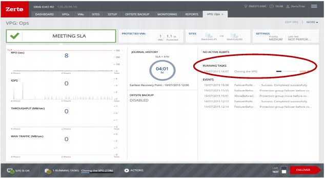 The cloning starts and the status is displayed in the VPG details tab.