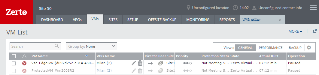 From time to time, a virtual machine or a host is removed from the hypervisor inventory for various purposes, such as maintenance. If the removed virtual machines are protected in VPGs, the VPGs enter a pause state and the replication is paused. The checkpoints of the VPG are retained. The removed virtual machine is grayed out in the virtual machines tab in the dashboard as well as in the Edit VPGs, VMs tab.