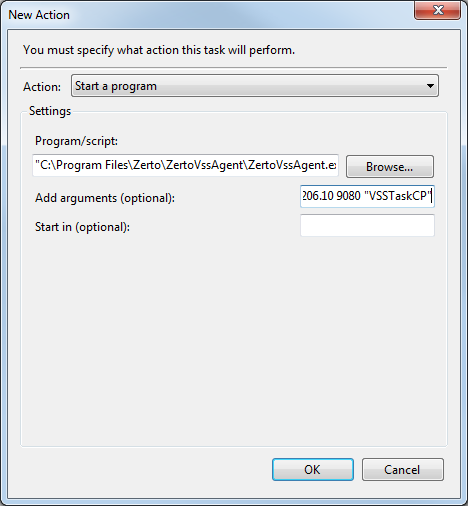 5. Select the Actions tab and create a new action to start the ZertoVssAgent with the IP address and port of the Zerto Virtual Manager and the checkpoint to use. For example: