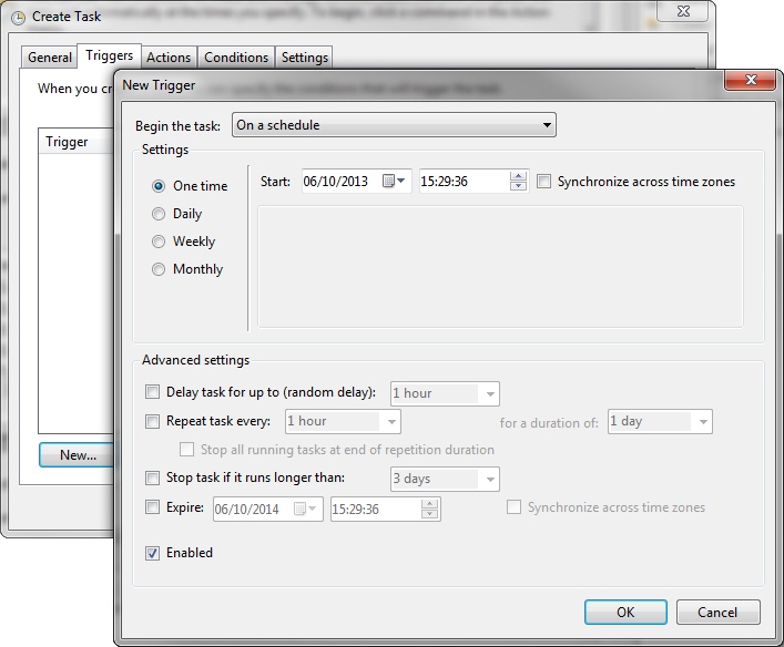 7. Select the Settings tab and make changes as required. Make sure Stop the task if it runs longer than is not selected.