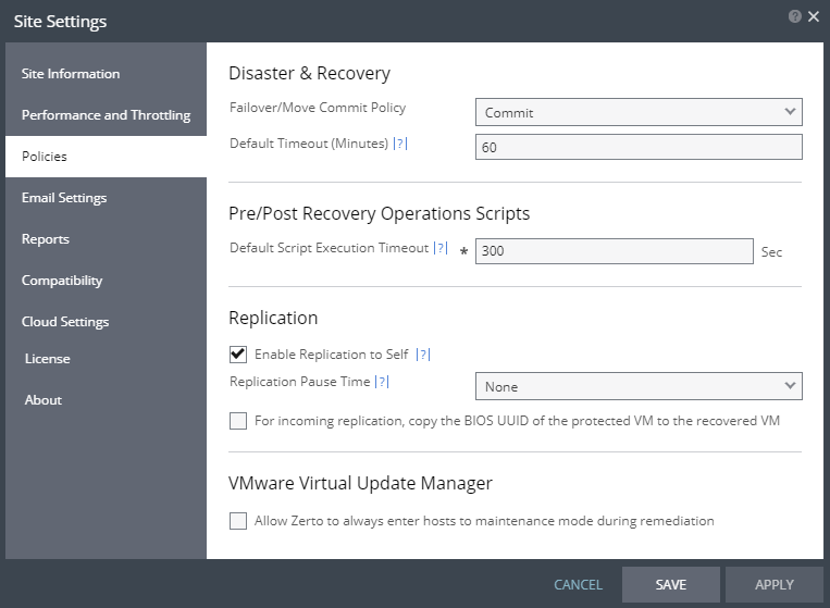 When this is selected, if the Virtual Update Manager's Remediation task is detected, Zerto will automatically enter the host into maintenance mode. The host will exit maintenance mode when the Virtual Update Manager's Remediation task is completed.