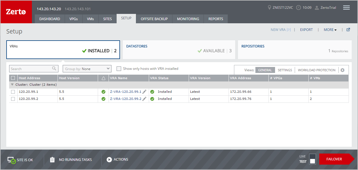 View details of the VRAs in the VRAs subtab, under the SETUP tab. All the hosts in the vCenter Server are listed, and details of VRAs for each host, when installed, are also shown.
