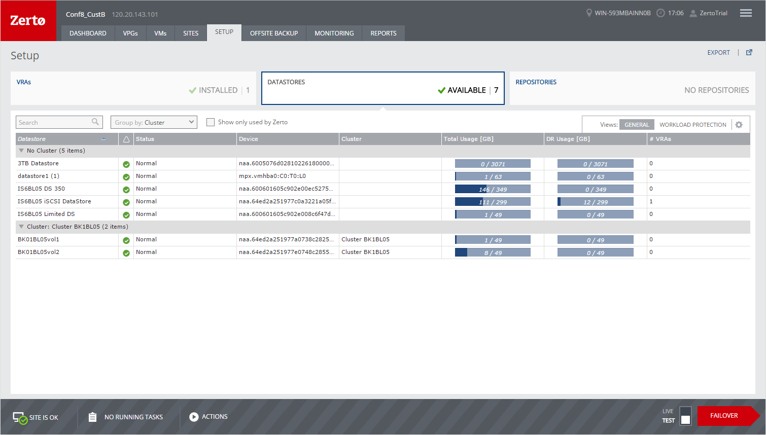 View details of the datastores used by Zerto Virtual Replication in the DATASTORES subtab, under the SETUP tab. This tab lists all the datastores used by Zerto Virtual Replication with an option to show all the datastores per cluster or for the hosts, whether used by Zerto Virtual Replication or not.