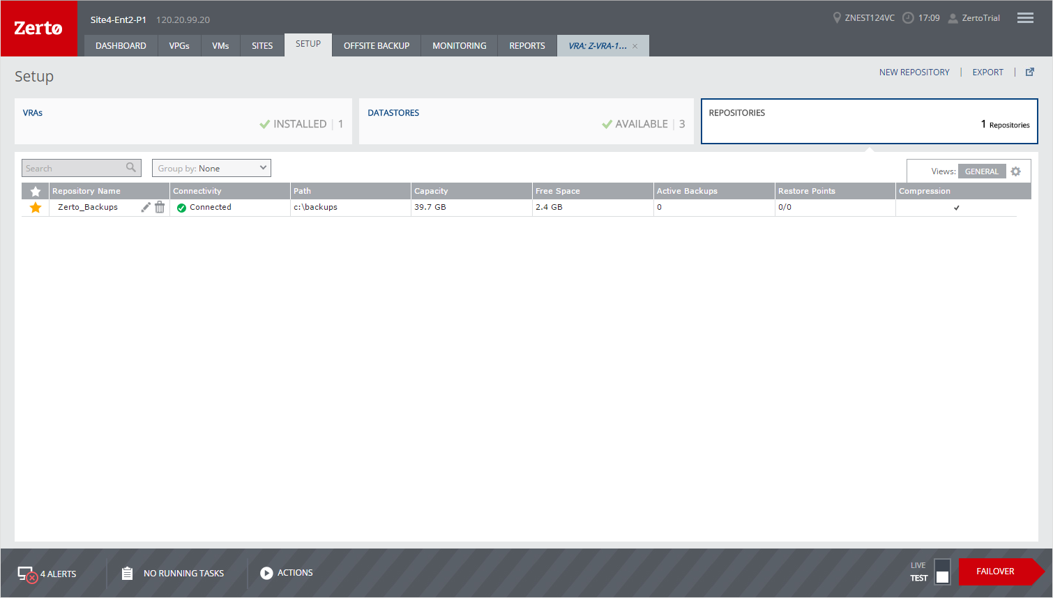 View details of the repositories that can be used for offsite backup jobs in the REPOSITORIES subtab, under the SETUP tab. This tab lists all the repositories created for the site.