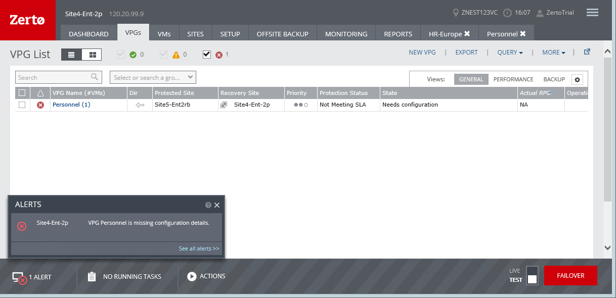 If you do not specify reverse protection, the protected disks are removed along with the protected virtual machines at the end of the procedure. In this case, if you want to move the virtual machines back again to the original site, you will not be able to use the original disks and an initial synchronization will have to be performed. The VPG definition is kept with the status Needs Configuration and the reverse settings in the VPG definition are not set.