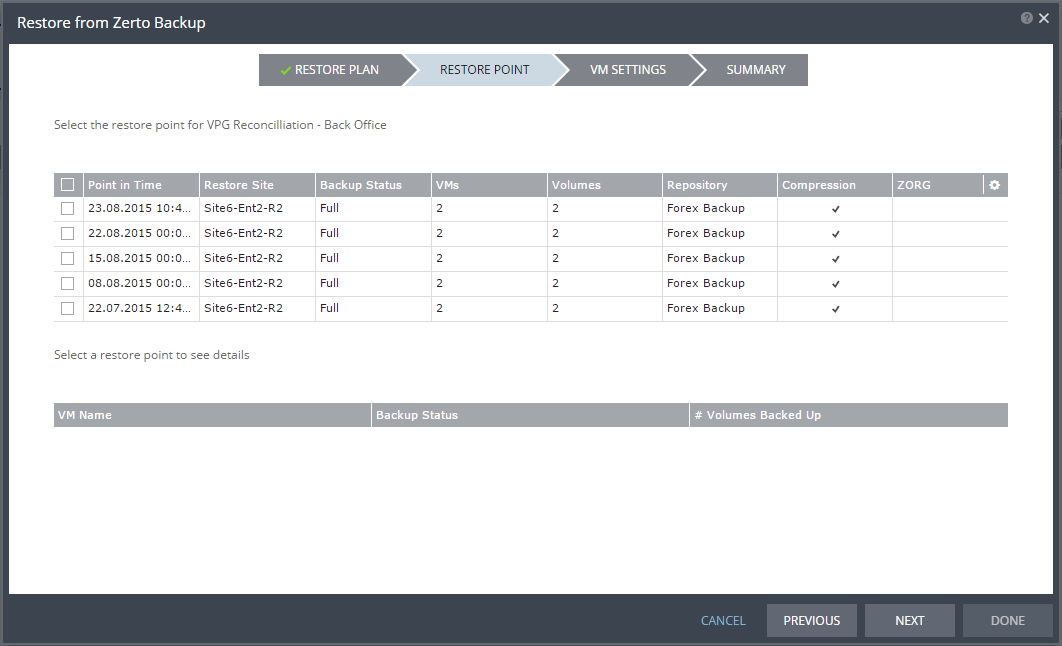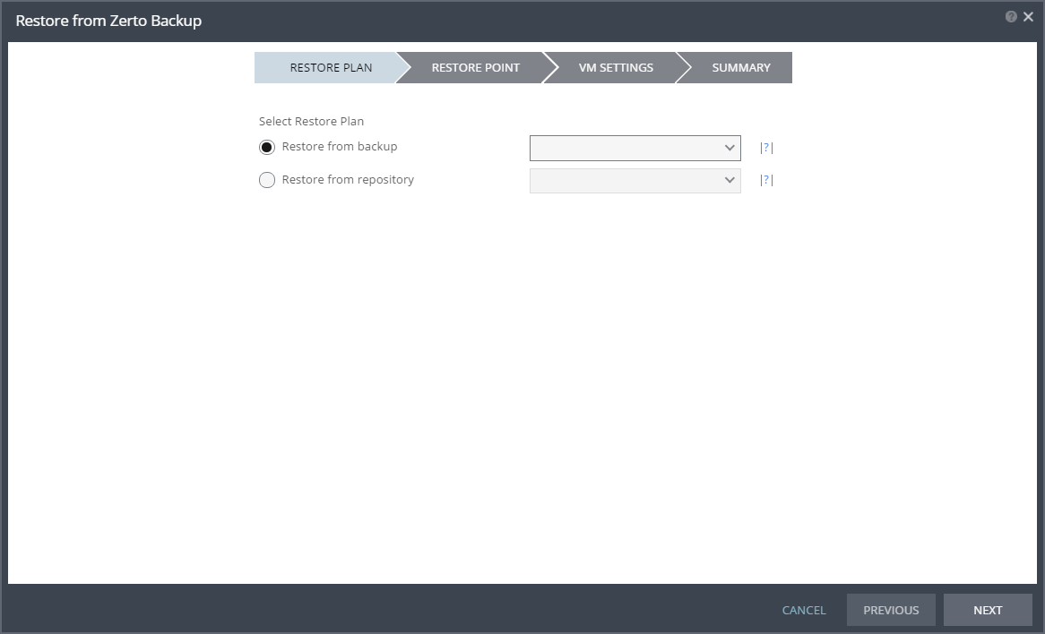 Note: When restoring via the VPG backup option, the VPG must still be available. If the VPG was deleted, the restore must be performed from a repository.