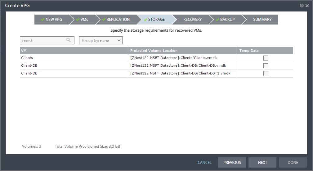 Note: Steps that do not require input are marked with a check mark. You can jump directly to a step that has been marked with a check mark to edit the values for that step. Every step must be marked with a check mark before you can click DONE to create the VPG.