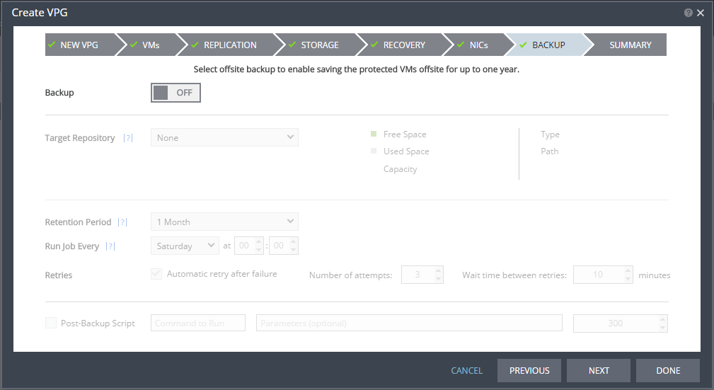 Target Repository – The name of the repository where the offsite backups are written. Repositories are configured via the
