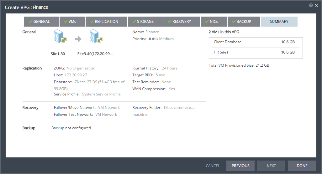 The SUMMARY step is displayed. It shows the VPG configuration that you defined in previous tabs.