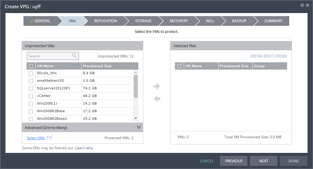 Virtual machines that are not yet protected are displayed in the list. A VPG can include virtual machines that are not yet protected and virtual machines that are already protected. You can view protected virtual machines by clicking Select VMs in the Advanced (One-to-Many) section.