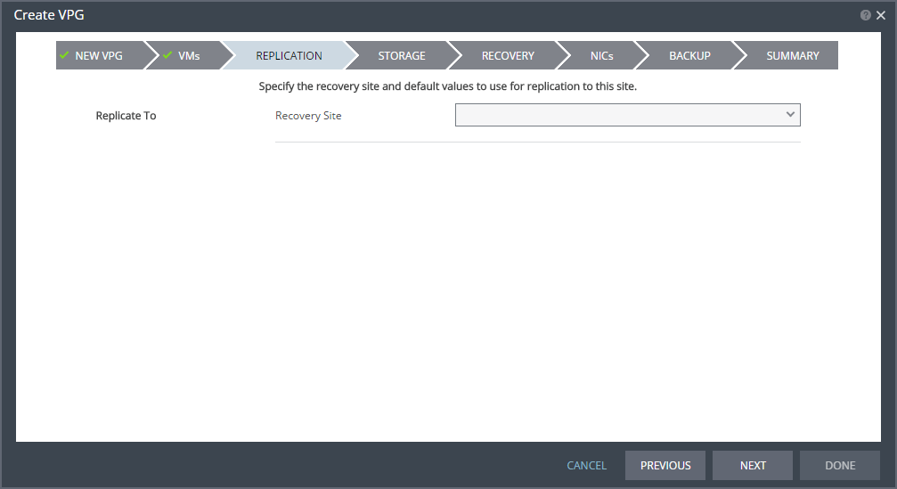 Note: You cannot select a recovery site if any of the virtual machines you selected are already in VPGs that recover to that site.
