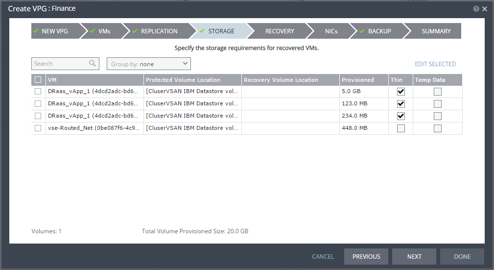 IMPORTANT: Changing the VPG recovery volume from thin-provisioned to thick-provisioned or vice versa, results in volume initial synchronization.