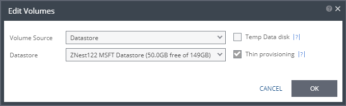 You can define Thin provisioning and Temp Data in this window, or you can alternatively define them when you separately select and edit each VMs volume.