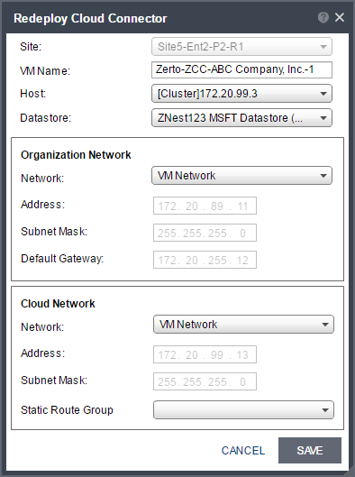 Static Route Group – The name of the group for which static routes are defined to the Zerto Virtual Manager network and VRA network. If a static route group is not specified, it is assumed that the Zerto Virtual Manager and VRAs are on the cloud network.