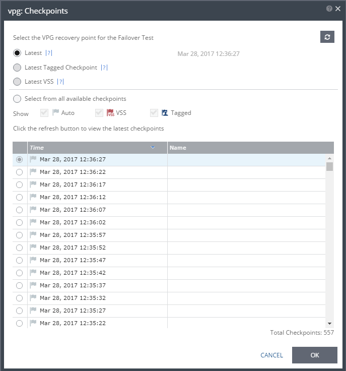Latest – Recovery is to the latest checkpoint. This ensures that the data is crash-consistent for the recovery. When selecting the latest checkpoint, the checkpoint used is the latest at this point. If a checkpoint is added between this point and starting the failover, the later checkpoint is not used.