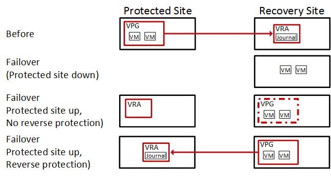 After completing a failover, when the original site is back up and running you can move the recovered virtual machines back again using the Move operation. The VPG that is now protecting the virtual machines on the recovery site has to be configured and then a Delta Sync is performed with the disks in the original protected site. Once the VPG is in a protecting state the virtual machines can be moved back to the original site. For details, see