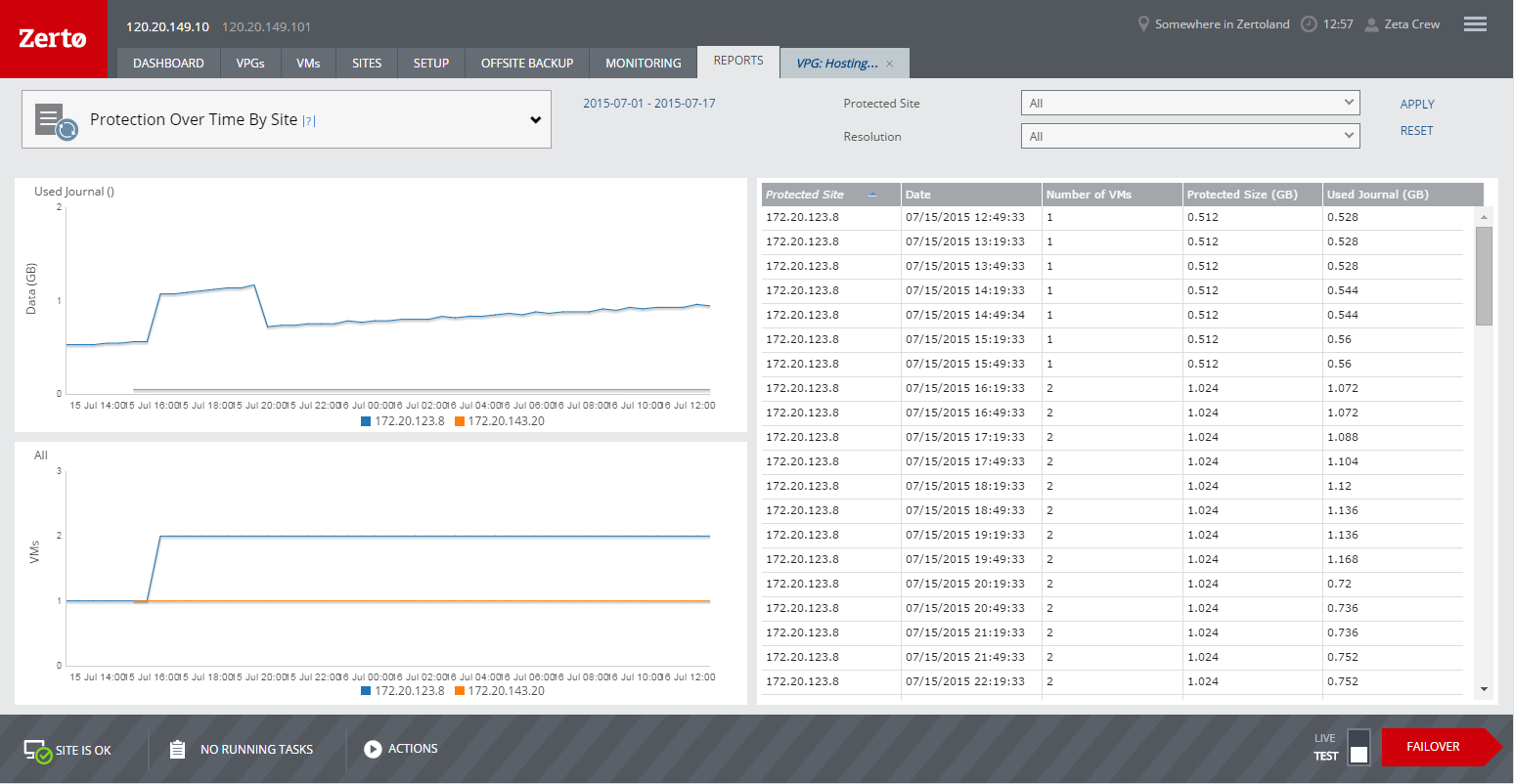 Information about the virtual machines and the amount of data on the recovery site can be displayed in the Protection Over Time by Site report under the REPORTS tab. When the report is displayed for the first time, information is shown per 30 minute intervals.