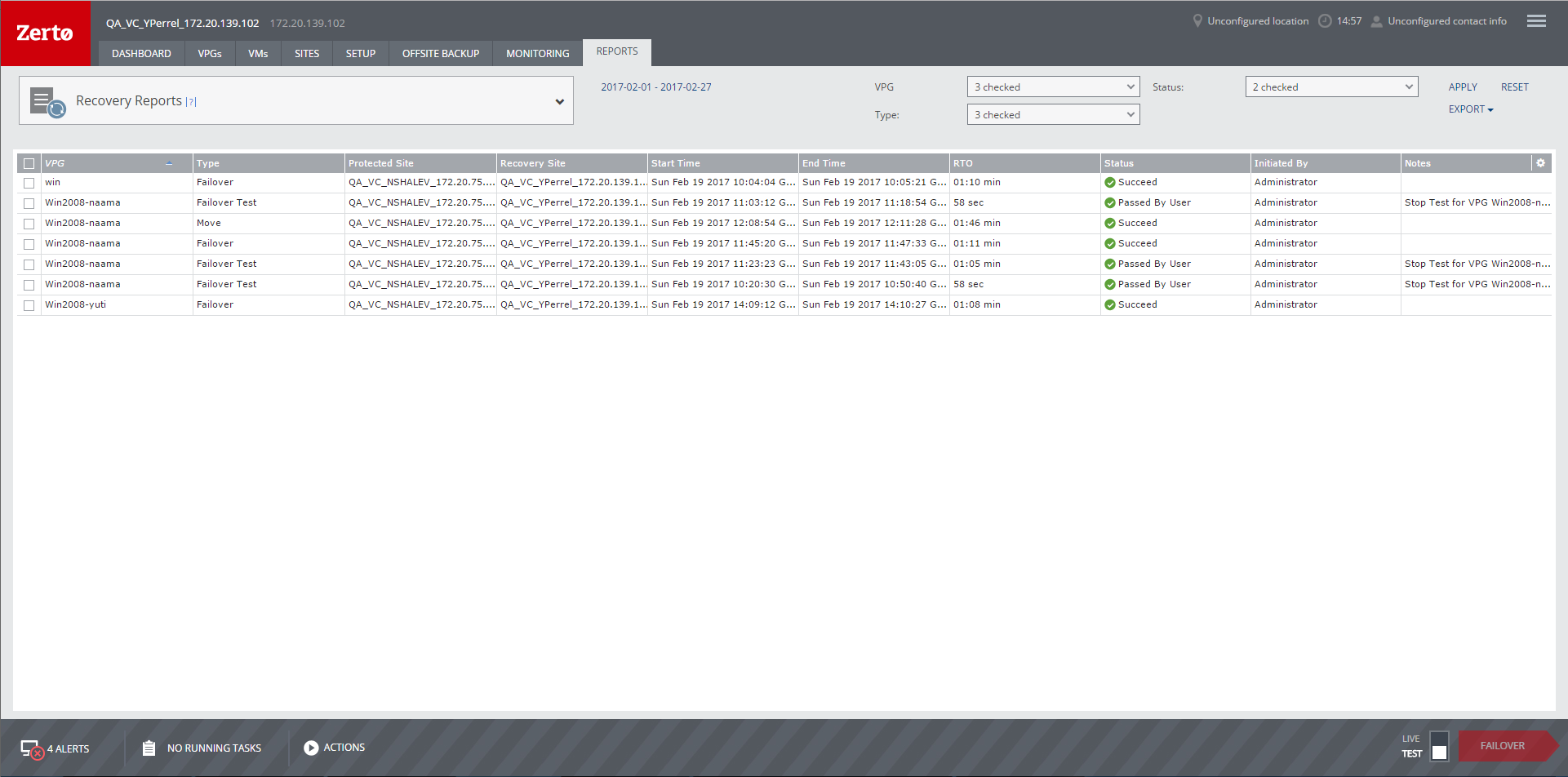 Information about recovery operations — failover tests, moves, and failovers — can be displayed in Recovery Reports under the REPORTS tab.