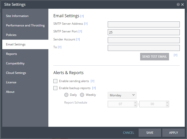 Information about offsite backups can be sent as a report every day or weekly on a specified day. To set up the report, select Site Settings > Email Settings.