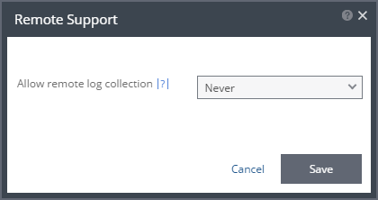 Never – Remote log collection is not allowed (default). If remote log collection is currently is allowed, it will be terminated if you select this option.