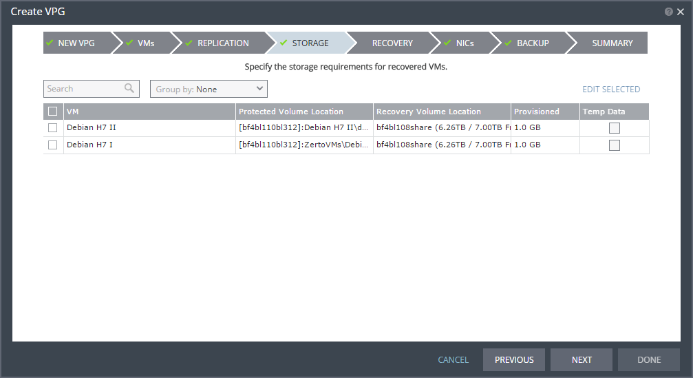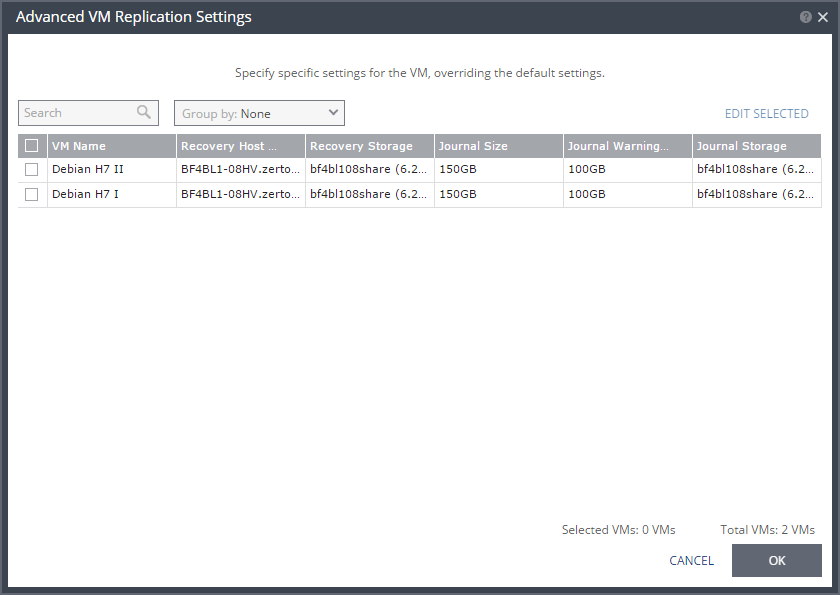 16. If you want to edit storage information for one of the virtual machines, select the machine and click EDIT SELECTED.