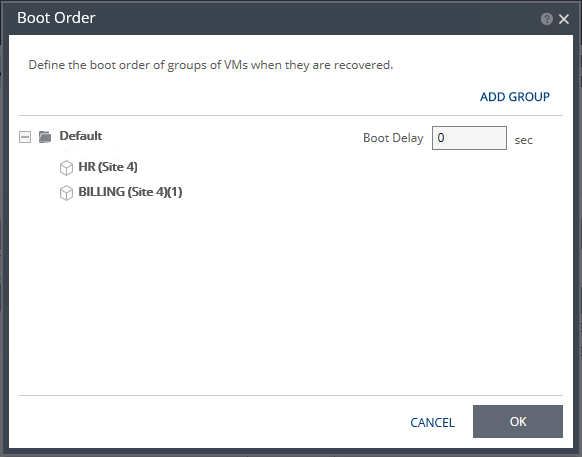 When virtual machines in a VPG are started in the recovery site, by default these machines are not started up in a particular order. If you want specific virtual machines to start before other machines, you can specify a boot order. The virtual machines are defined in groups and the boot order applies to the groups and not to individual virtual machines in the groups. You can specify a delay between groups during startup.