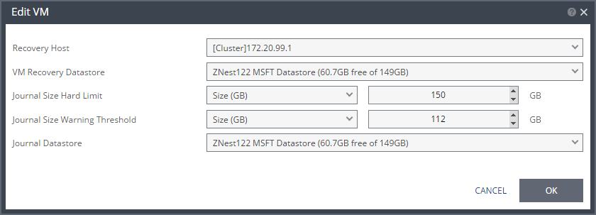 Journal Datastore: The datastore used for the journal data for each virtual machine in the VPG. To change the default, specify a host and then select one of the datastores accessible by this host to be used as the journal datastore. When you select specific journal datastore, the journals for each virtual machine in the VPG are stored in this datastore, regardless of where the recovery datastores are for each virtual machine. In this case, all the protected virtual machines must be recovered to hosts that can access the specified journal datastore.