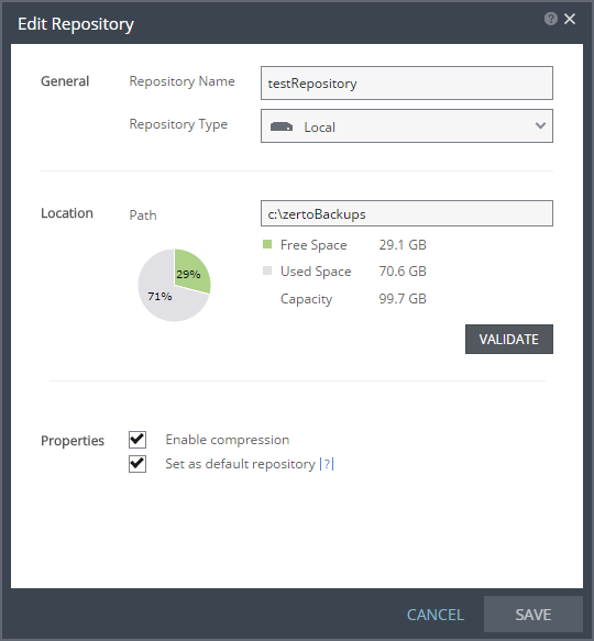 Enable compression – Check this option to compress backups stored in the repository. Compression is done using zip compression, set to level six. If you want better compression, which requires more CPU, or less compression to reduce the CPU overhead, contact Zerto support.