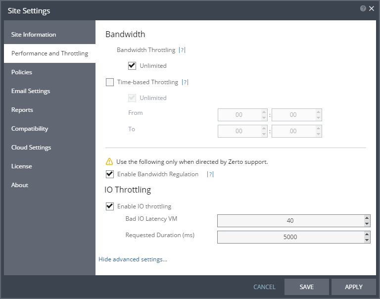 Advanced Settings should only be changed in coordination with Zerto support:
