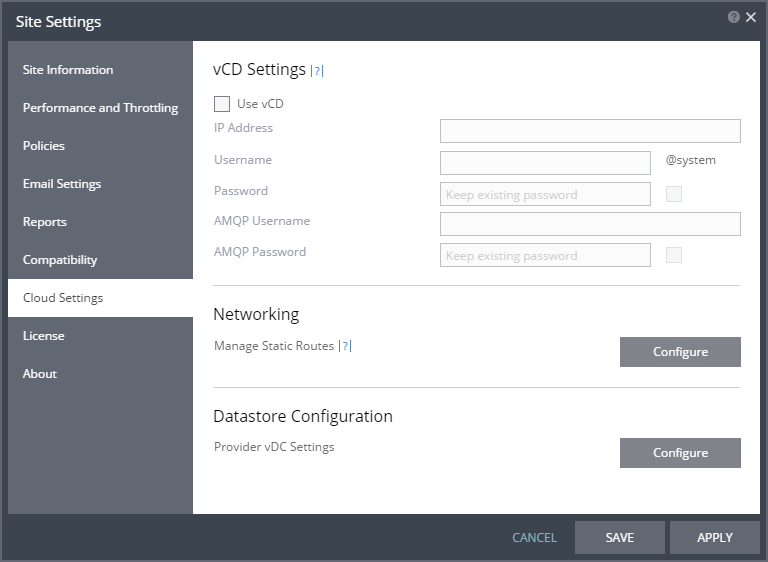 The Zerto Virtual Manager User Interface : Site Settings Dialog : Cloud Settings Dialog